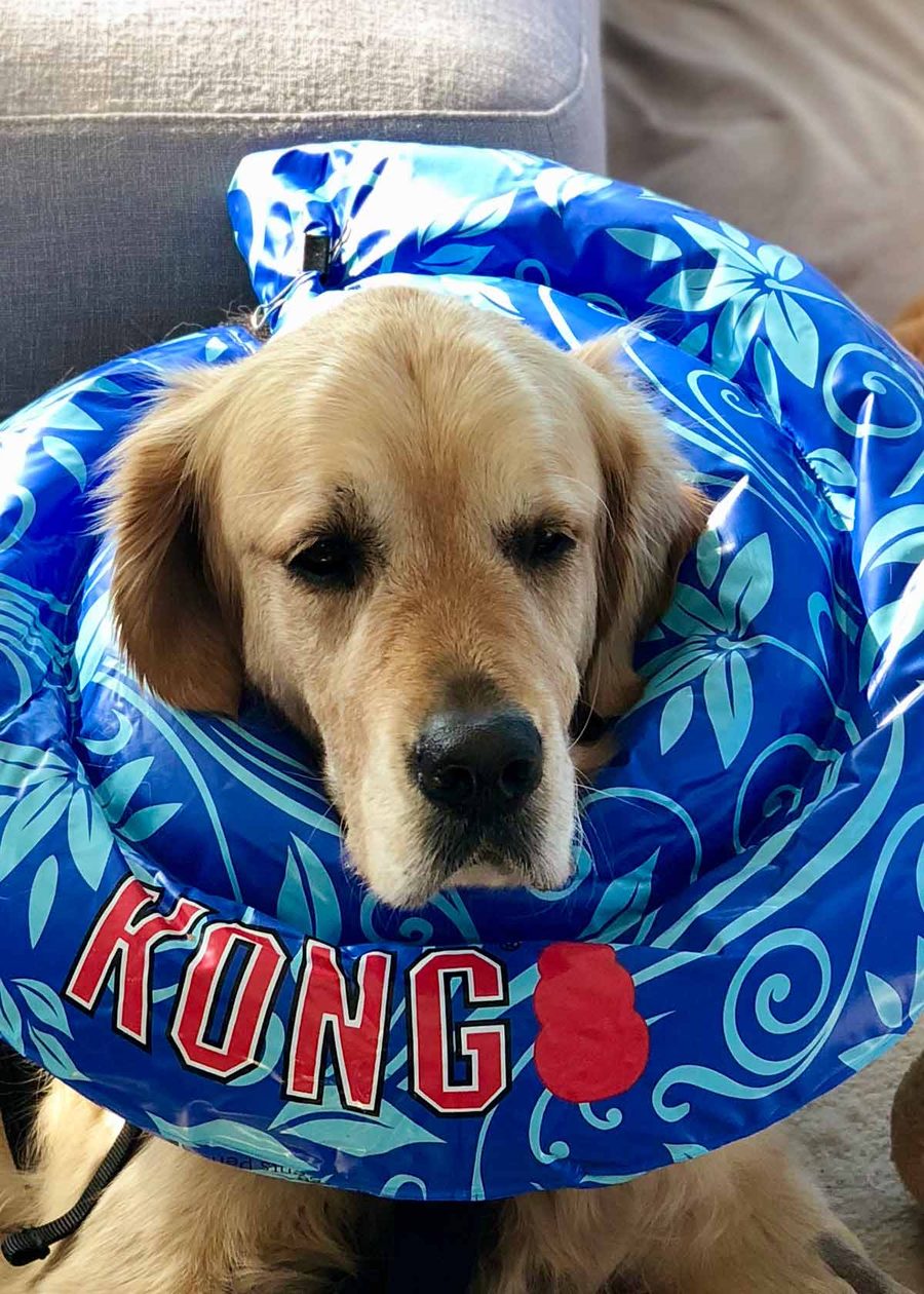 The other challenge was the head cone which is used to stop dogs from licking wounds. Dozer, being the big buff-head that he is, just couldn’t deal with a giant flappy plastic cone around his head. So I ended up resorting to a blow-up ring which he found much more comfortable with the added bonus of amusement for me.