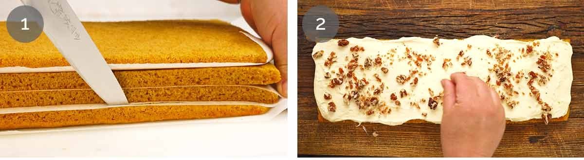 - Cut – Invert a piece of cake onto a cutting board. Cut in half lengthways. Trim as needed for level, even layers. Cover each piece of cake with its own sheet of baking paper (trimmed to size), with overhang for ease of handling.