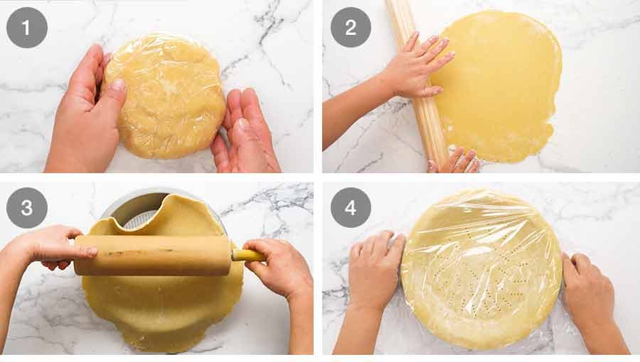 To line the pie tin, roll the pastry off the work surface on to the rolling pin, then unroll it over the pie tin. This is not just the simplest technique to transfer the pastry (no tearing!) but you will also avoid stretching the pastry which then causes the crust to shrink when it bakes.