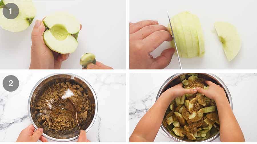 Toss with spices and sugar – Put the apple slices in a large bowl. Mix the sugar and spices in a separate small bowl (I know you just want to dump them straight in but then the spices don’t disperse evenly). Now sprinkle the mixture over the apple slices and use your hands to toss well, separating the apple slices as needed so they are evenly coated.