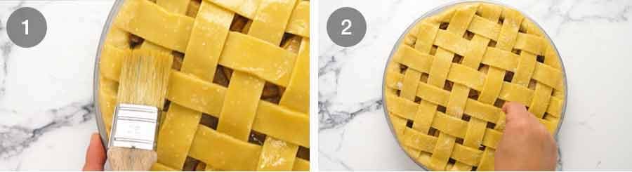 Egg wash – Brush the lattice with egg wash, taking care to avoid the cooked pie rim (else it will get overly brown). Also ensure you don’t end up with pools of egg in the lattice joins, which will be unsightly.