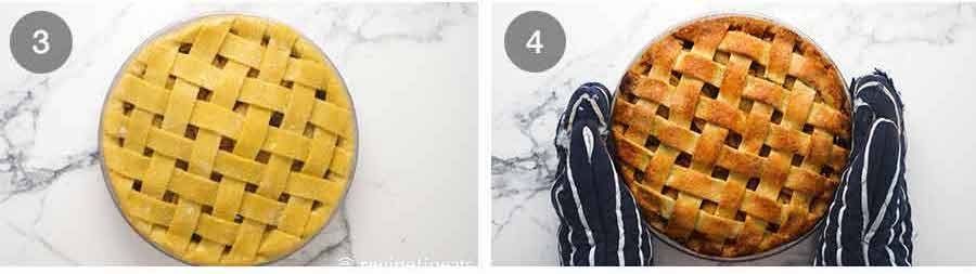 - Pastry lattice or lid: Top with pastry lattice – see in post for my method. Trim excess, and press to adhere on to pie crust rim using water to seal. Brush lattice with egg wash (avoid the pie rim else it will over-brown there), ensuring you don't get pools of egg in the joins. Sprinkle with sugar.