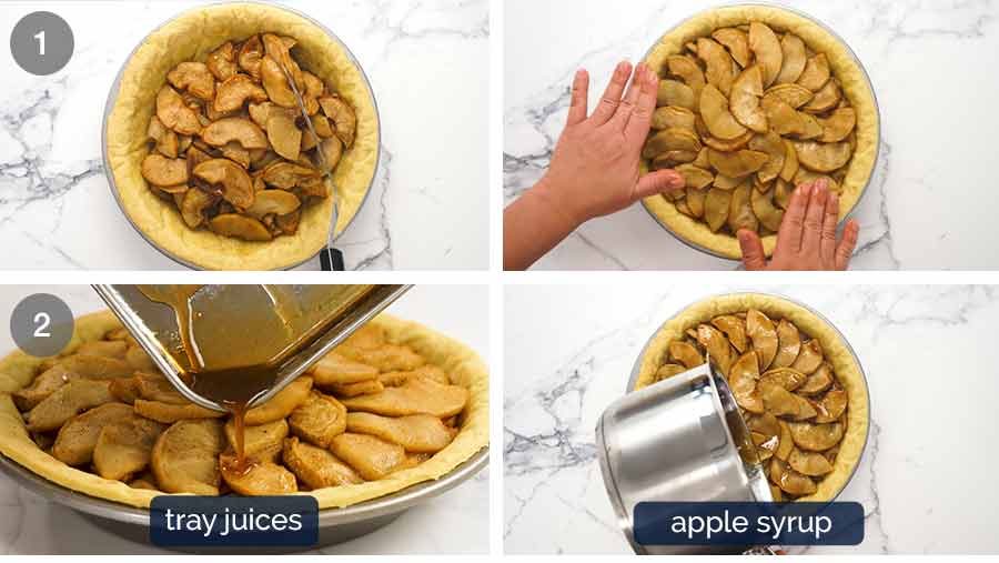 - Fill: Use a spatula or egg flip to scoop up apple slices. Fill the pie crust with 2/3 of the apples, gently pressing out air pockets. Then arrange the remaining apples on top so they mound slightly at the centre. Pour apple syrup over the slices and any residual juices from the baking trays.