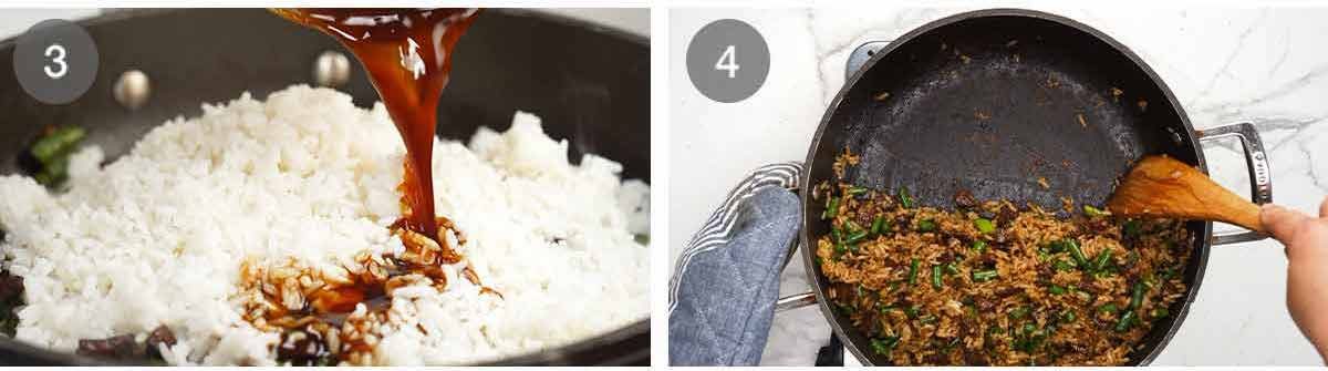 - Rice and sauce – Add the rice and sauce. Toss for a good 1 1/2 – 2 minutes to give the rice a chance to get toasty.