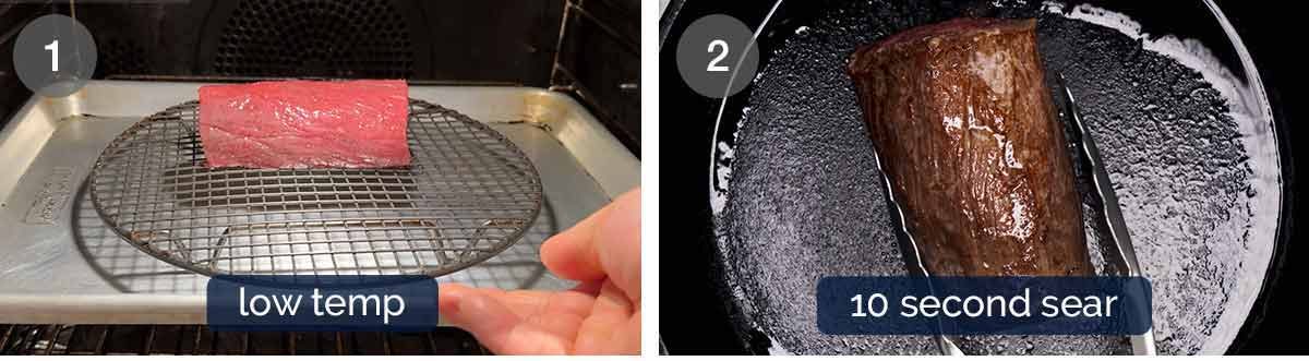 So, after trying a handful of methods, I found slow roasting to be the easiest, low-risk method that yields the best results for edge-to-edge perfectly rare-not-raw beef with a very thin seared crust (which literally takes 10 seconds on the stove). The lower temperature roasting is also the proved and much-loved method I use for premium cuts of roast beef including prime rib (standing rib roast) and beef tenderloin roast.