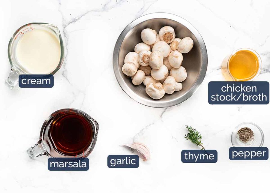 Here’s what you need for the creamy mushroom sauce which is heavenly with the beef! The magic ingredient is Marsala, an Italian fortified wine that gives the sauce a gourmet flavour. You need something for beef tenderloin – because it doesn’t produce enough drippings to make a good gravy like you can do with lamb leg, or red wine sauce like I make for beef prime rib (standing rib roast) without using a homemade beef stock (carton stock just doesn’t cut it). I really tried, but it just lacked flavour!