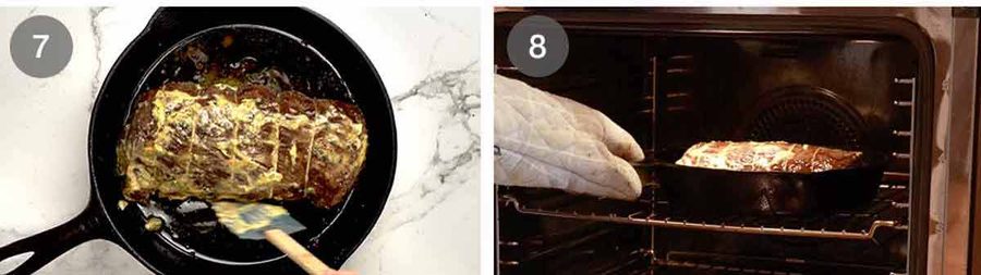 - Sear – Heat oil in an ovenproof heavy based pan over high heat until smoking. (Note 6) Brown the surface of the beef all over, aggressively and quickly. Then put the beef back on the rack to cool for 15 minutes (so the butter doesn't instantly melt when you put it on).
