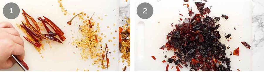 - Deseed – Trim and discard stems. Cut lengthwise, remove and discard the seeds. Roughly chop into 1 – 1.5cm / 1/4" pieces.