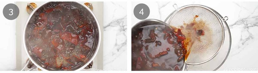 - Reserve 1/2 cup of chilli-simmering water. Drain chilli in a sieve, lightly press out residual liquid.