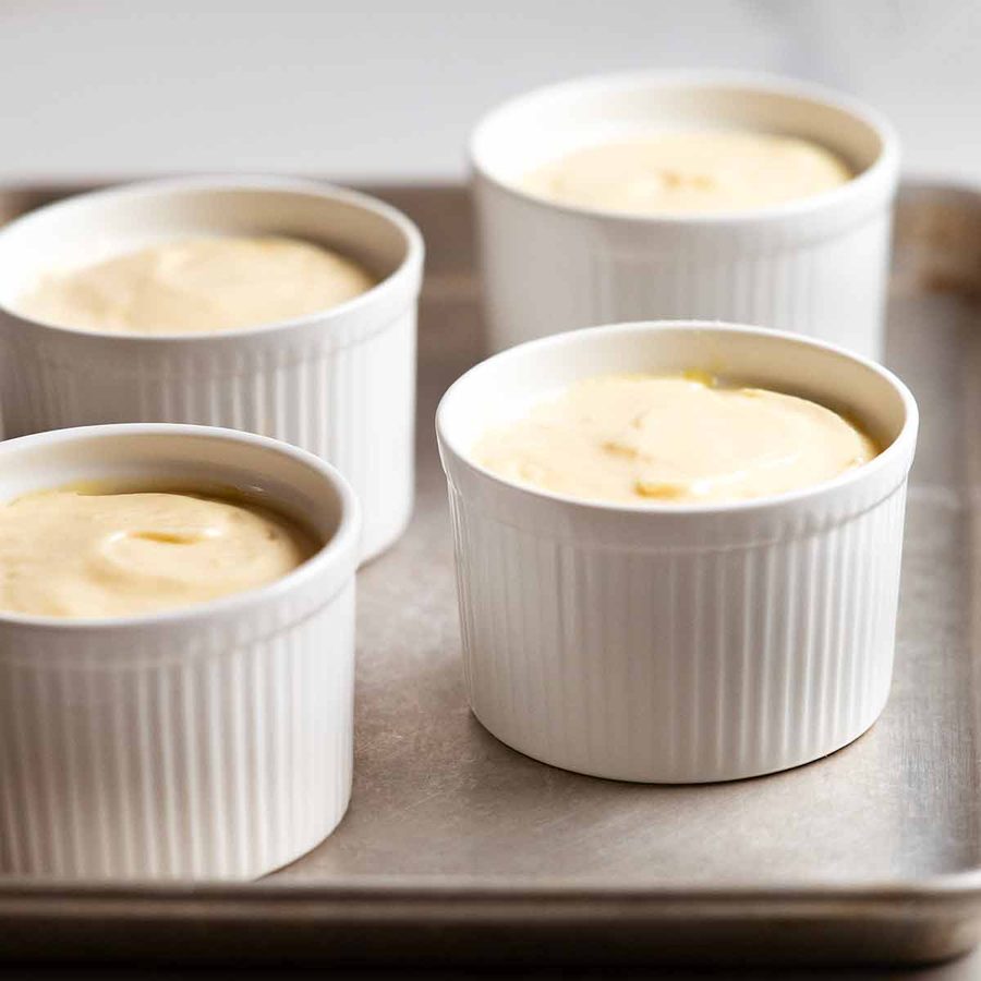 - Fill the ramekins – Pour the mixture evenly into the ramekins using a ladle or a large serving spoon, filling to about 1cm / 0.4" below the rim. Smooth the tops with the back of a teaspoon dipped in water, no need to be 100% meticulous here, just get rid of big bumps. Run your thumb around the inside rim of each ramekin to clean it, this gives the soufflé a clean edge to rise against.