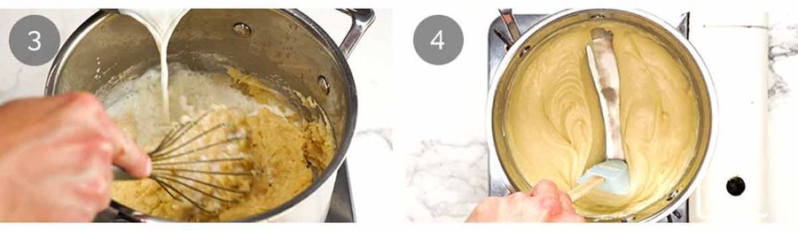 Make the roux – While the milk warms, melt the butter in a large saucepan over medium heat. Add the flour and whisk gently. It will look thick and pasty at first, like wet sand. Keep whisking for about 2 minutes until it becomes smooth and shiny. Make sure to scrape into the corners of the pan and don’t let it brown. If it’s cooking too fast, lower the heat.
