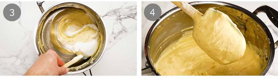 - Fold gently – Give the Mornay a quick whisk to make it smooth again then add in a quarter of the egg whites and whisk it in to loosen it. Then gently fold a third of the remaining egg whites in using a rubber spatula until mostly incorporated. Use slow, sweeping motions from the bottom of the pot, you want to keep as much air in as possible. (See video at 2.15 minutes) Rough folding = flat soufflé. Few lumps are ok. Repeat twice more with the rest of the egg whites.