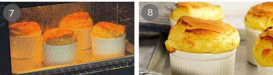 - Bake – Place the ramekins on a baking tray and bake for 20 minutes until tall and golden. Do not open the oven door while it's baking, the sudden drop in heat will make them sink. When it's cooked, the soufflés should jiggle a bit when you shake the ramekin.