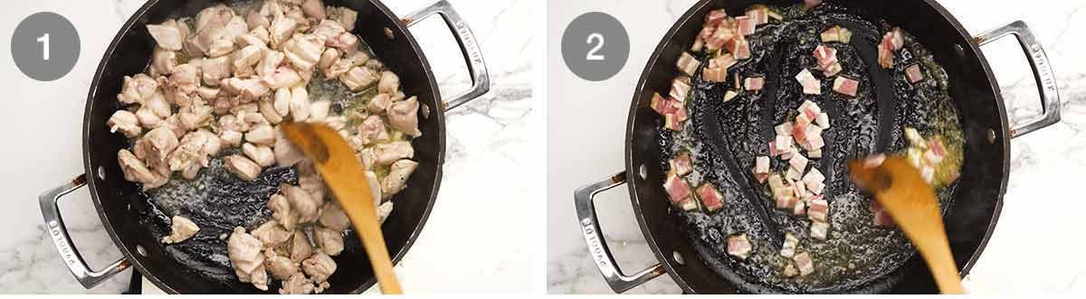 Bacon – For the filling, start by cooking the bacon in the same pan for 1 minute. By giving it a head start, we get the tasty bacon fat melting in the pan which we use to cook everything else.