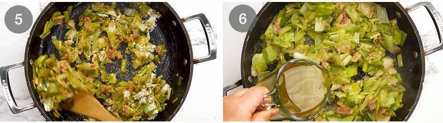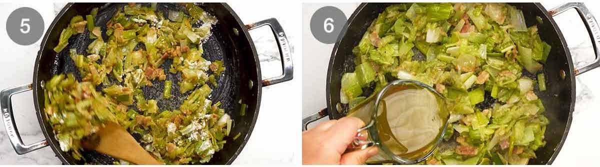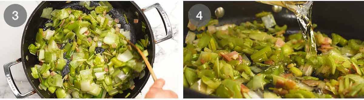 - Sauté – In the same pan, cook the bacon for 1 minute. Add the leek, celery and garlic. Cook for 5 minutes until the celery is softened. Don't let the leek brown – lower the heat if needed.