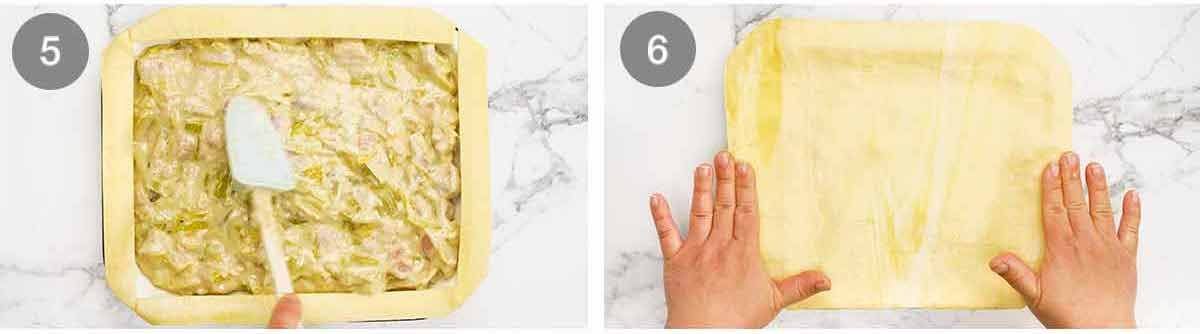 The filling for the pie is a roux-based creamy filling (ie a flour-thickened filling). I’ve used cream to make it extra luxurious and pie-worthy but you can substitute with milk to cut down on the calories.