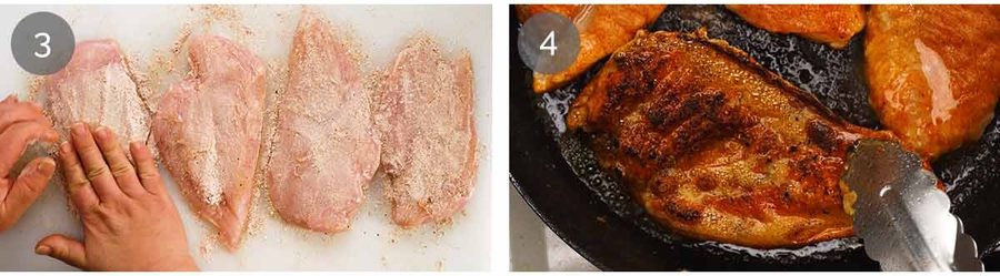 Coat the chicken with the seasoned flour mix. There should be just enough to coat both sides of each piece. Just sprinkle it on and spread with your fingers.