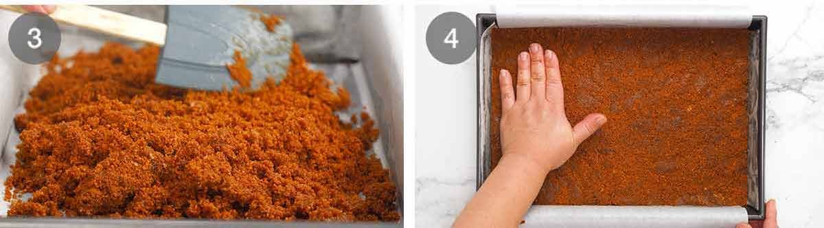 - Press – Pour into the prepared pan. Spread then use your hand or something flat to press it in firmly (firmer = more stable base). Refrigerate until required.