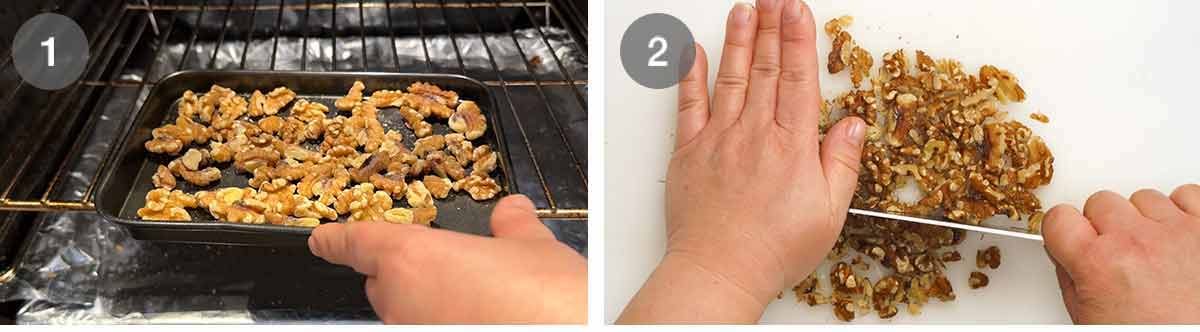 - Toast walnuts – Put the walnuts on a tray and toast for 8 minutes. Cool for 5 minutes on the tray then roughly chop into 5mm / 0.2" pieces.