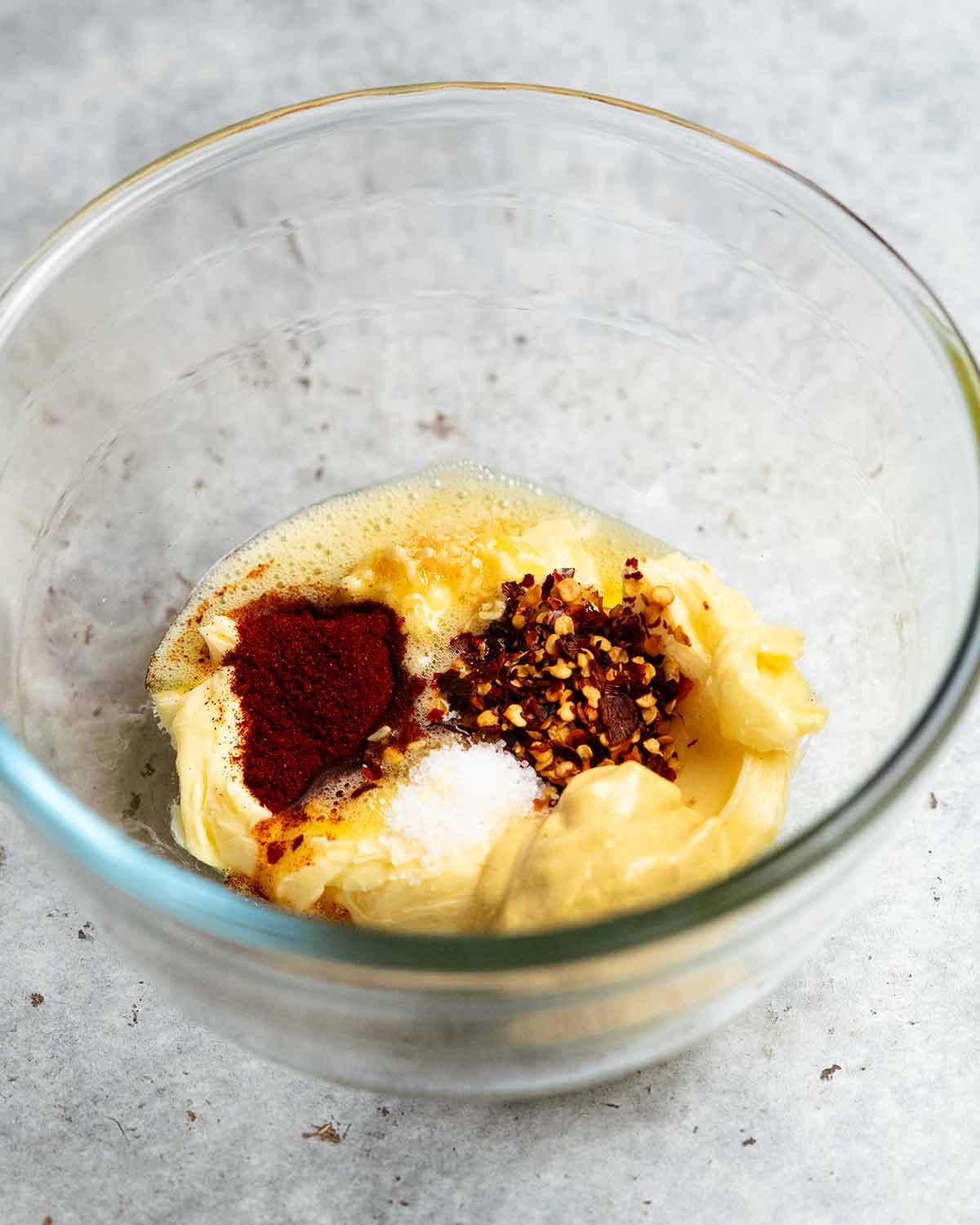 - Mix – Put the rest of the butter and remaining ingredients in a small mixing bowl. Pour the garlic butter over. Mix until combined.
