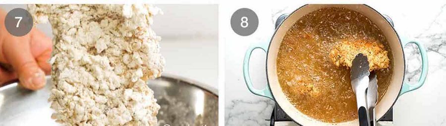 Marinade flour clumps – This is the trick to the ultra crunchy chicken! Drizzle 2 tablespoons of the marinade into the flour mixture then use your fingers to mix it in. The flour will form little clumps.