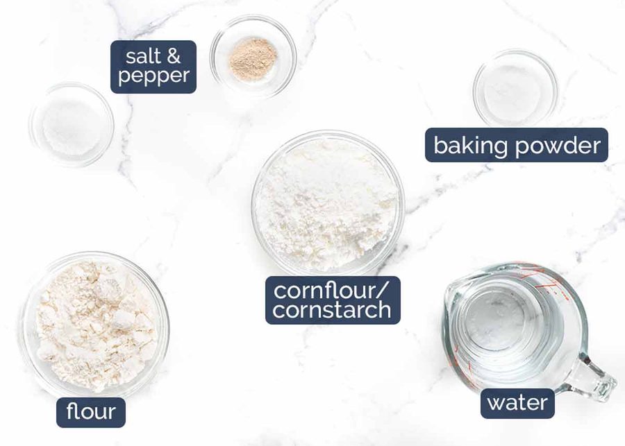 Flour and cornflour/cornstarch – Just regular plain flour (all-purpose flour). We use a very specific ratio of each to achieve the right level of crispiness and golden colour. This is because cornflour makes things crispy but won’t fry up golden, and if you use too much, the batter is chewy and gets stuck in your teeth. On the other hand, flour batters fry up beautifully golden but are not as crispy, and they soften so quickly. So I use both!