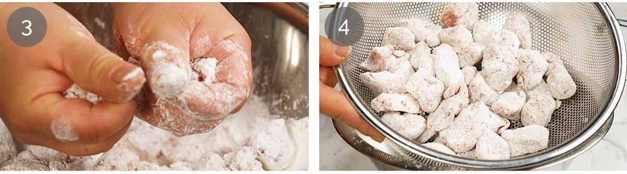 - Crispy coating – Sprinkle over the 1/2 cup of cornflour and toss with fingers to coat each piece, separating pieces stuck together. Give each piece a light squeeze in your fist to make the cornflour stick – you can do 2 or 3 pieces at a time in each hand. Drop into a colander, then give it a shake to remove excess cornflour – important step. (Note 4)