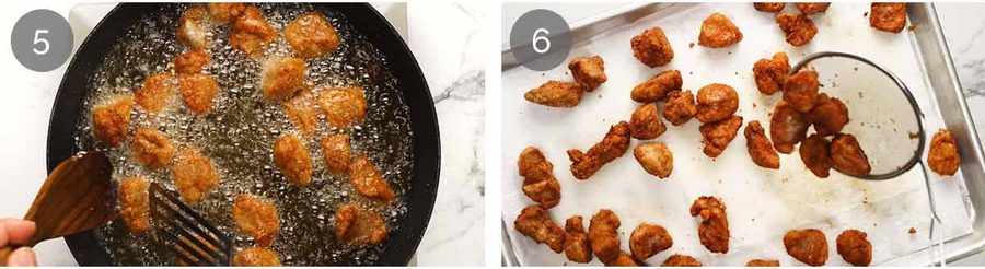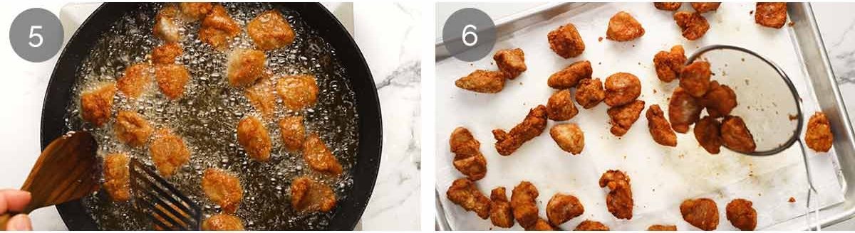 - Heat 0.5 cm / 0.2" oil in a non-stick pan or large pot over high heat – dip a piece of pork in, it should sizzle straight away.