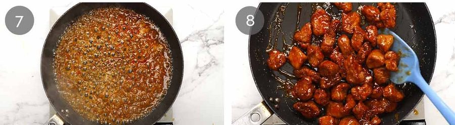 - Sauce – Pour out all the oil (strain and re-use, it's very clean). Return the pan to medium heat. Add the Sauce ingredients, stir and let it simmer for 2 minutes until it thickens into a syrupy consistency.