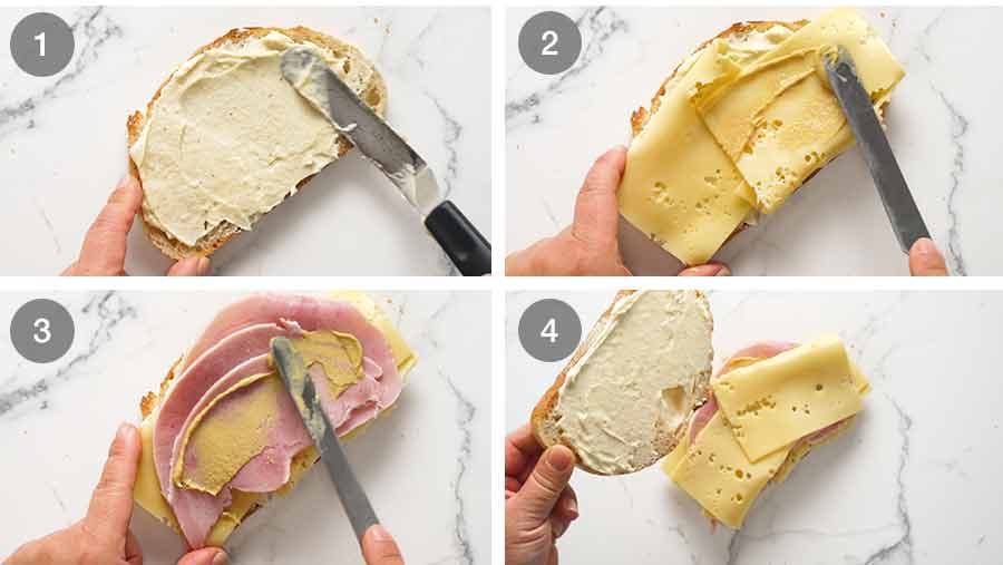 - Cheese + Dijon: Top two pieces of bread with 2 slices of gruyere or Swiss cheese each (fold as needed to make them fit). Then spread the cheese with half the Dijon Mustard (this might sound weird, but see in post for why we do this!).