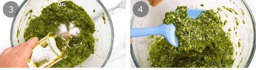 Stir the oil and salt in. DO NOT BLITZ! The sheer power of the stick blender will emulsify the oil with the liquids and turn the sauce into a pale green smoothie. How do you think I know this??!! 🫣