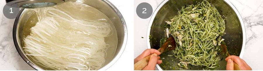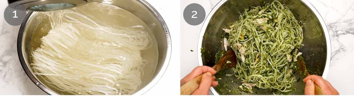 - Toss the noodles with the Green Ginger Sauce first. Toss well so it coats the noodles nicely. Then add the chicken, toss well again. (If you add chicken first, too much sauce clings to it). Loosen with a touch of water if needed.
