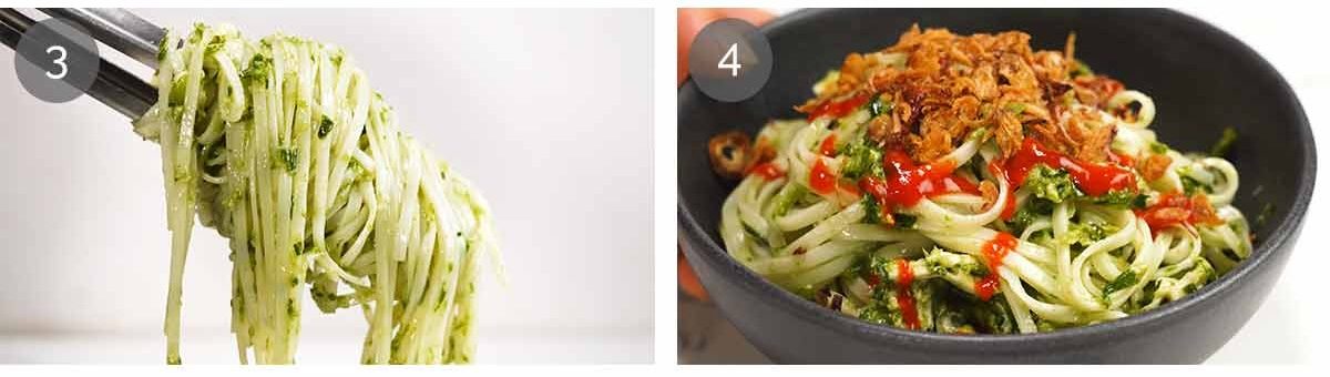 Dried rice noodles – I used thin rice stick noodles, the kind that’s flat that makes a surface for the Green Ginger Sauce to cling to. Specifically, I use these ones – Changs Pad Thai Rice Noodles, yes I use them for Pad Thai too! I think rice noodles work better than yellow noodles as they have a more neutral flavour so it really lets the flavour of the sauce shine, and the green colour stands out more against white.