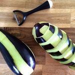 - Use a potato peeler to peel "strips" off the eggplant vertically as per the photo below. If your potato peeler is not sharp enough or if the eggplant is on the soft side, you might need to do this with a small sharp knife.