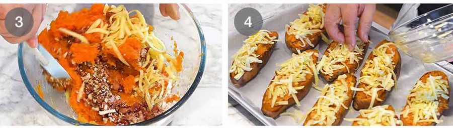 - Stuff – Place halved sweet potato back on a paper lined baking tray and stuff them equally with filling. Sprinkle with leftover cheese and bake for 25 minutes until cheese is melted.