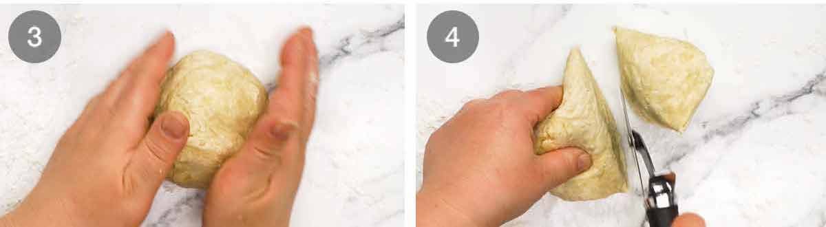 - Roll out #1 Sprinkle the counter lightly with flour. Scrape the dough out then knead a few times to bring it together into a ball. Cut in half. Roll one piece out to 3mm / 1/8" thin oval shape. (Note 3)