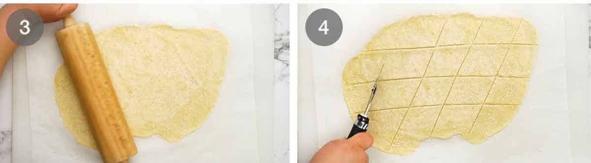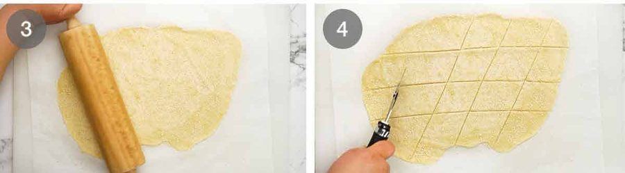 Roll out #1 – Cut the dough in half then roll out into a 3mm / 1/8″ thin oval shape. Or whatever shape you end up with. It doesn’t really matter because we cut it, and misshaped offcuts from the edges are rustic and real! Use a little sprinkle of extra flour as needed to stop the dough from sticking to the counter or the rolling pin.
