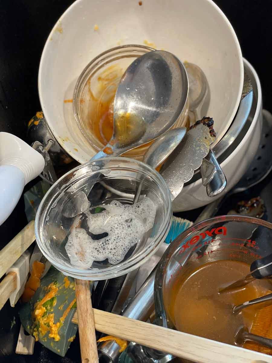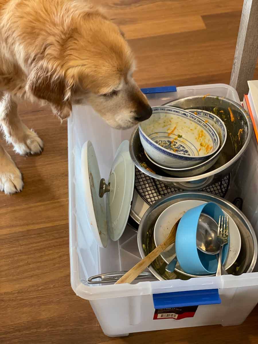 And as you might imagine, with lots of cooking comes lots of dirty dishes. So many dishes!!! I’ve taken to a system of using a large tub to keep dishes out of the way, and tackling them in big loads at a time. And strangely, all of a sudden, Dozer has taken an interest in helping with the washing up….😂