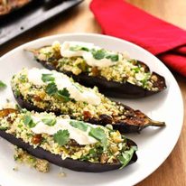 - To serve, pile each eggplant high with couscous, finish with a dollop of yoghurt (see notes for vegan alternative) and garnish with cilantro. Best served warm but also delicious at room temperature.