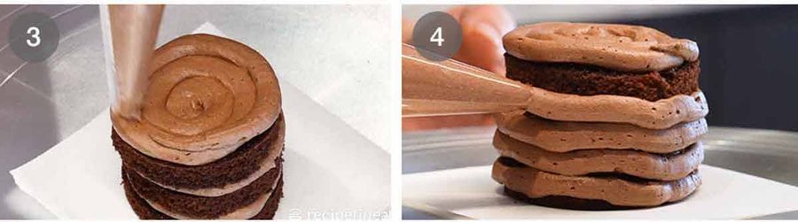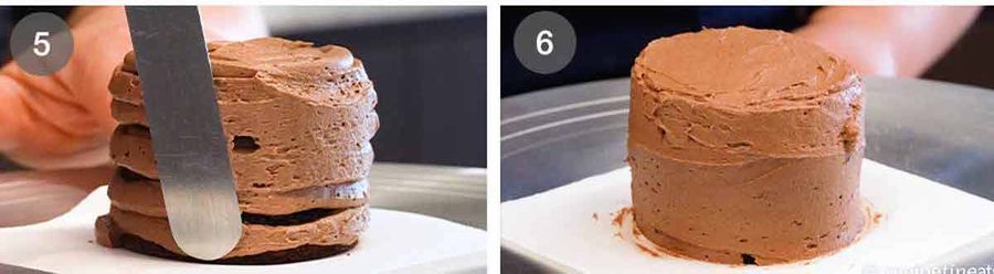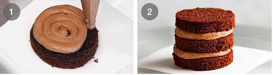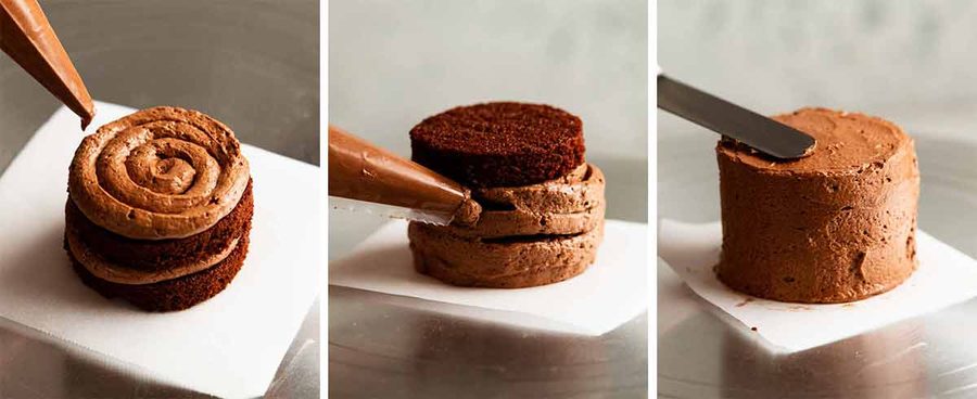 - Pipe frosting – Place a piece of cake on a small piece of paper, using a dab of frosting to stop it from sliding. Pipe coils of frosting on the layers, using 3 rounds for each cake. Pipe frosting around the sides and on the top. (A cake turntable is handy if you've got one but not essential.)