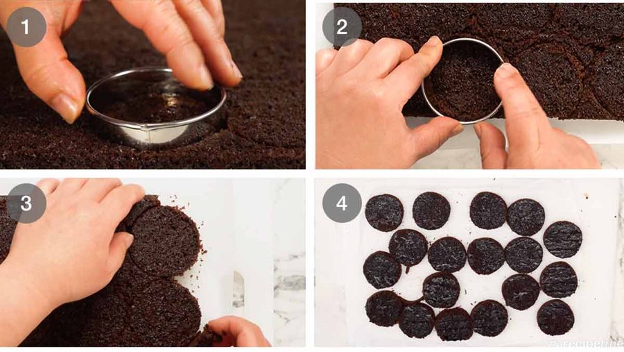 Cool in the pan for 10 minutes then use the paper to lift it out onto a cooling rack. Leave to cool on the paper for at least 30 minutes, then refrigerate for another 1 to 4 hours (uncovered) to fully, fully cool. ⚠️ Cooling properly is an important step because otherwise the cake may be too fresh and crumbly to cut out neat circles.