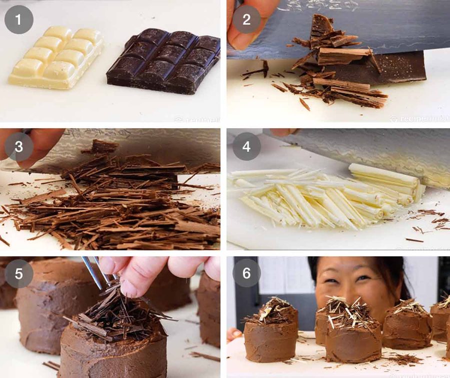 - Dark chocolate , finely shaved using a knife (white chocolate is also pretty)
