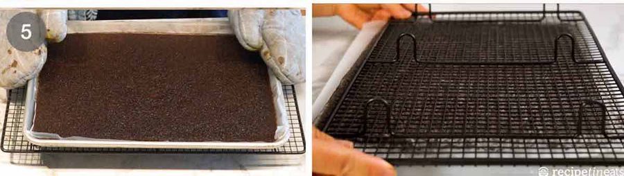 - Cool for 10 minutes then use the paper overhang to lift the cake onto a rack and cool for 30 minutes (leave it on the paper). Then refrigerate uncovered for at least 1 hour before cutting rounds (cake is too soft when freshly baked).