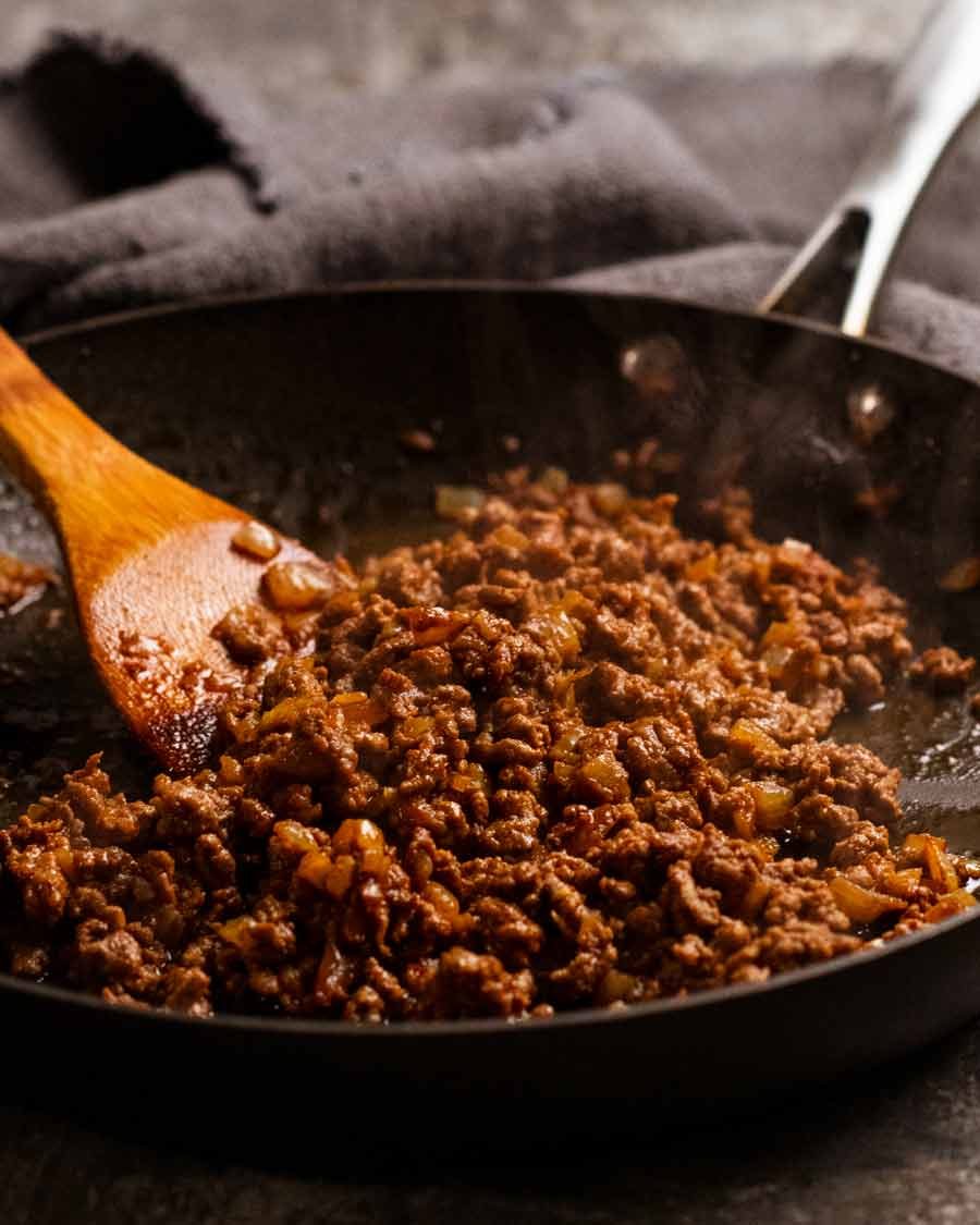 - Spiced topping – Heat oil in a non stick skillet over medium high heat. Cook onion and garlic for 1 minute. Turn heat up to high, add lamb/beef and cook, breaking it up as you go, until you no longer see red. Add reserved spices and salt, then cook for a further 1 minute. Add tomato paste and cook for 1 minute. Stir in water, cook for 1 minute until it's juicy but not watery.