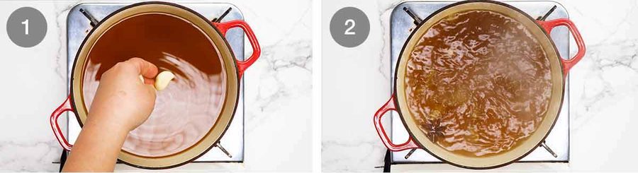 Broth – Pour the stock into a small pot over high heat. As it is coming to the simmer, measure out and add the soy sauce, Chinese cooking wine, sugar and star anise. Cut the garlic in half, slice the ginger (no need to remove the skin) and plonk that in. (Let’s say this takes