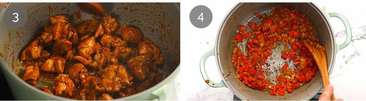 - Sear – Heat the 2 tablespoons of oil in a large heavy based pot over high heat. Add the chicken and cook until the outside is sealed and gets a bit of colour (it won't go golden). Remove with a slotted spoon into a bowl, leaving oil behind in the pot.