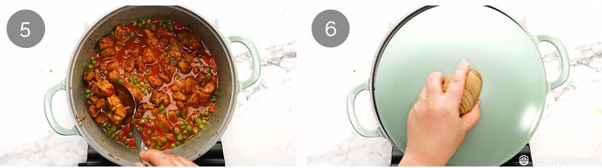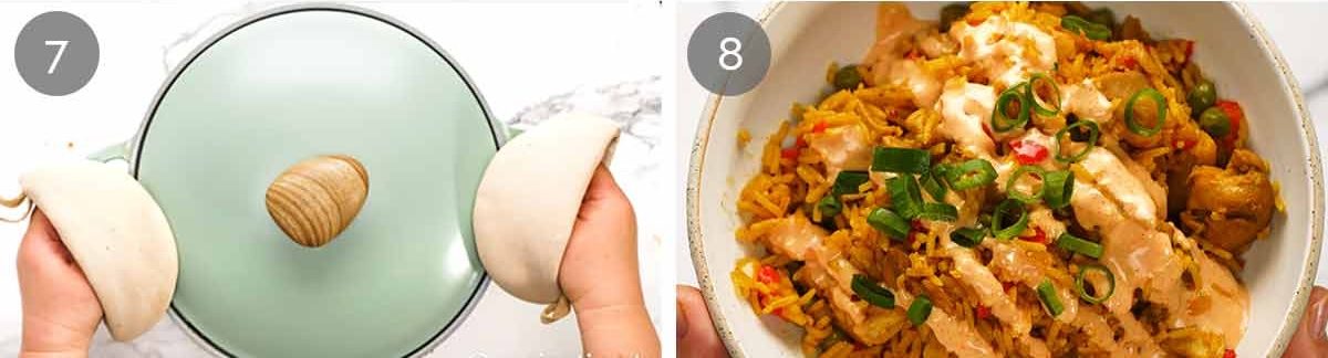 - All in – Add rice and stir to coat in the tasty oil. Add remaining rice ingredients, then scatter the chicken evenly across the surface. Also add any juices accumulated in the bowl. Stir, bring to a simmer, then put the lid on and lower heat to medium low so it's simmering gently. (Note 3)