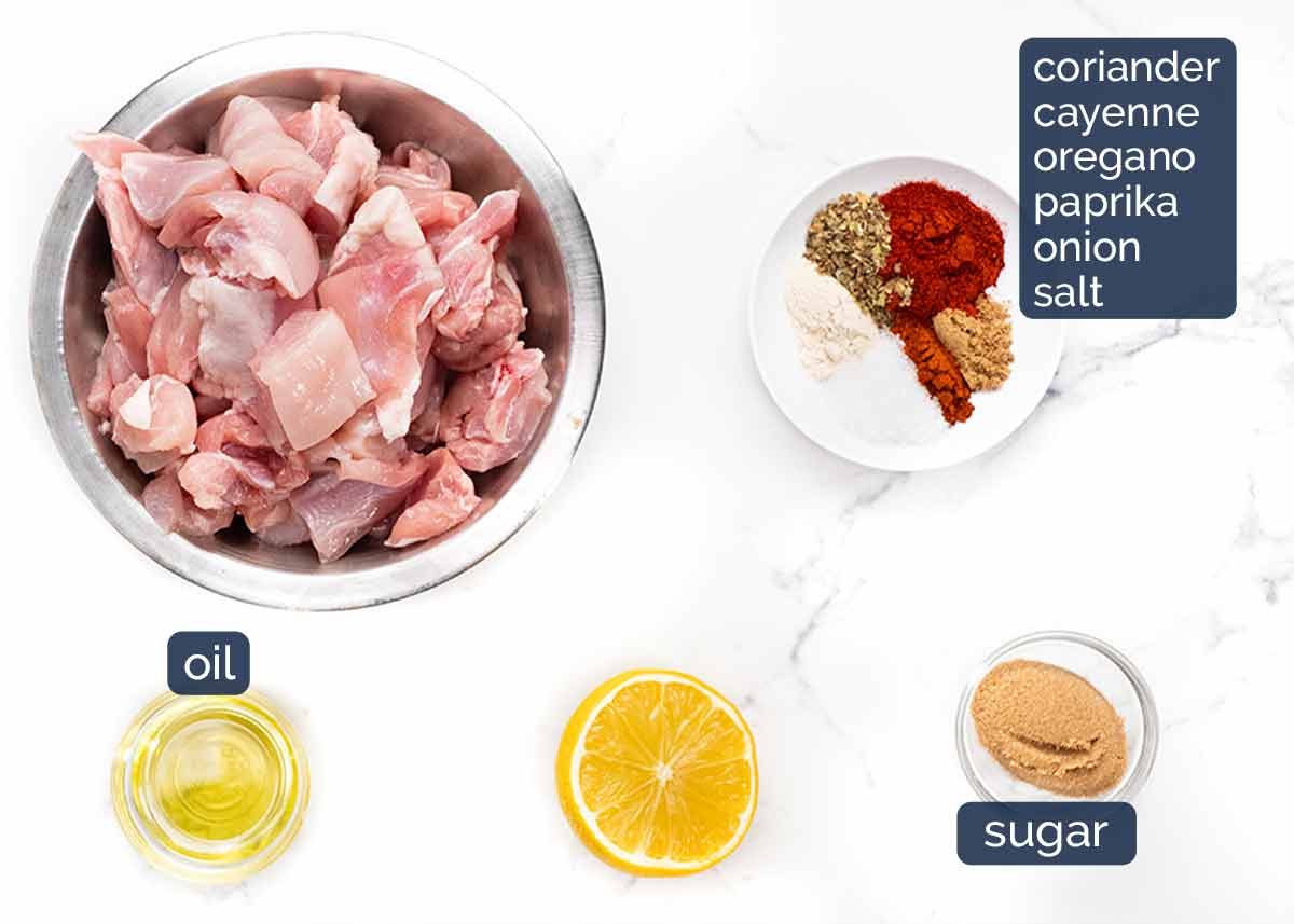 Wet ingredients (to make a paste so it coats the chicken) – olive oil and lemon juice (substitute with apple cider vinegar, or other clear vinegar).