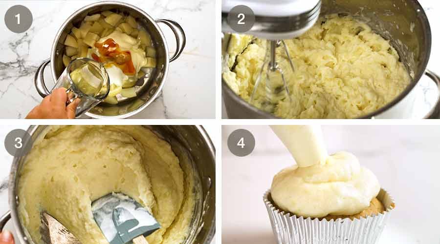 The trick here is to cook the potatoes until very, very soft – literally fall apart – so when you “whip” it up with yogurt, water and honey, it will become smooth with a fluffy buttercream frosting consistency!