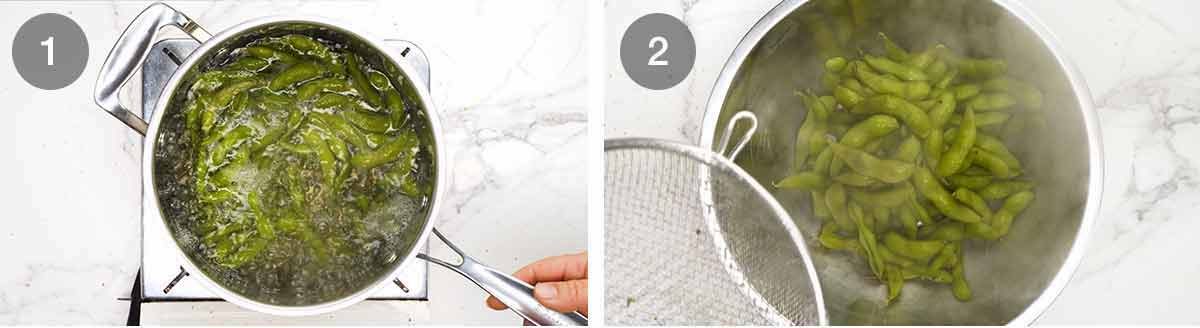 Cook the edamame from frozen in salted boiling water for 2 minutes. NOTE: Many packets will instruct to boil for 5 minutes. That’s not necessary as the edamame is already pre-cooked, and it also dulls the green colour. Also, some packets will include microwave or steaming directions which you can also use. I prefer to boil in lightly salted water for a little extra seasoning on the skin.